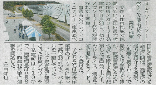 2020年11月28日(土)に、岡山県美作市の太陽光発電所「パシフィコ・エナジー作東太陽光発電所」では、初の試みとなる地域住民を対象にしたイベント「作東太陽光祭り」を、社員はPCR検査を事前に実施するなど新型コロナウィルス感染症の対策を徹底した上、開催いたしました。